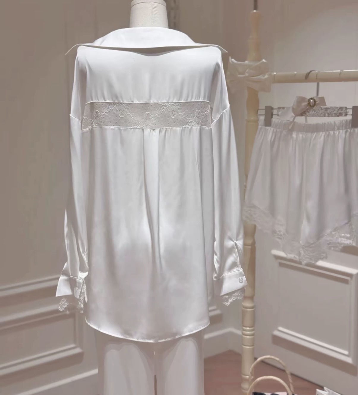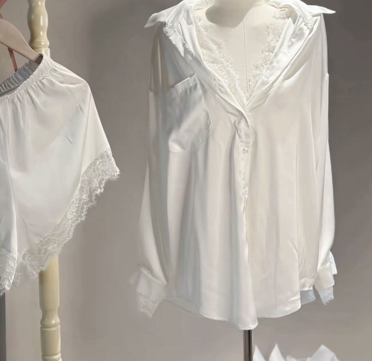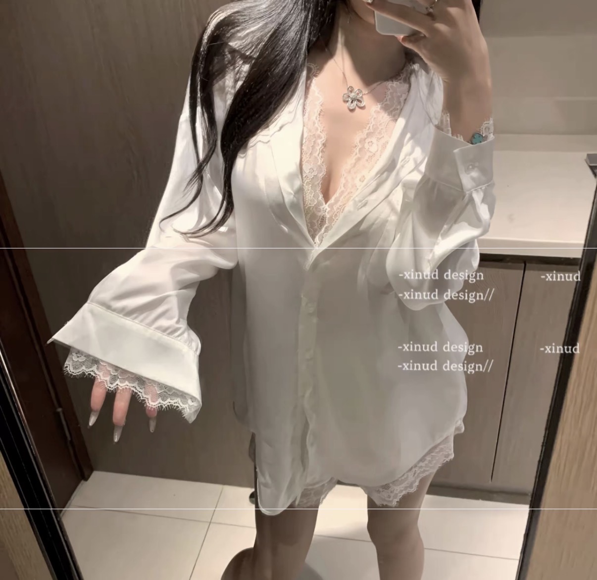 【初恋女友】纯欲风蕾丝性感长袖白衬衫薄款法式家居套装