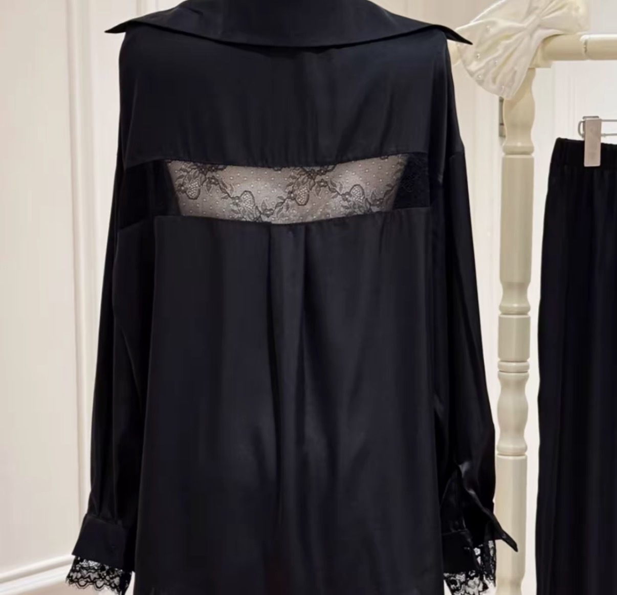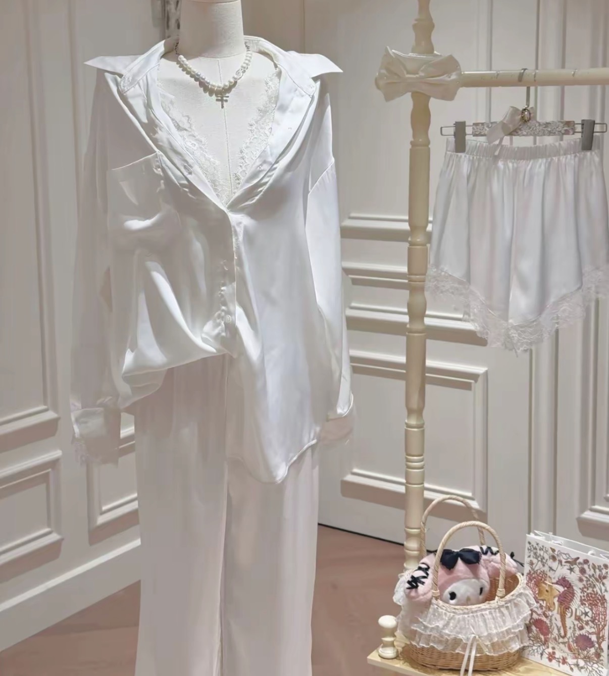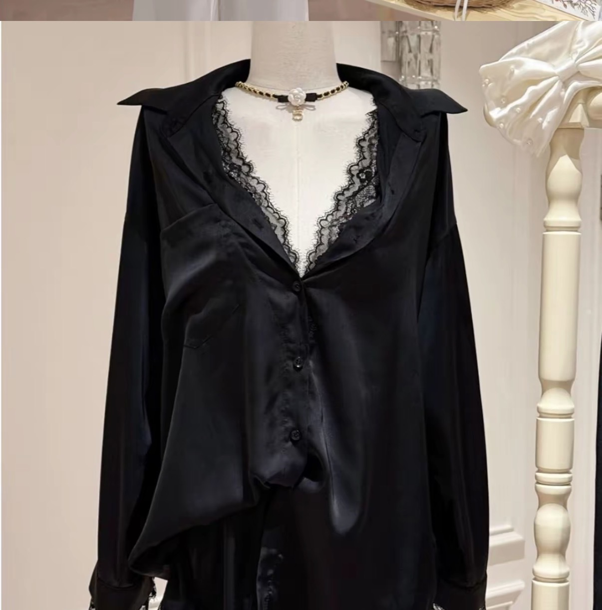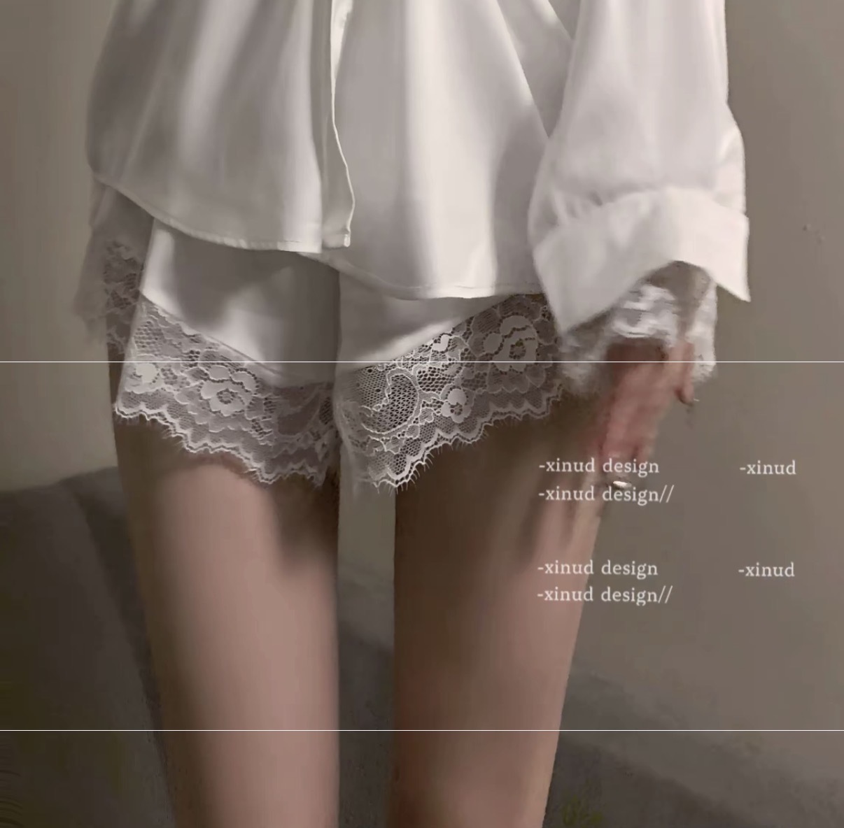 【初恋女友】纯欲风蕾丝性感长袖白衬衫薄款法式家居套装